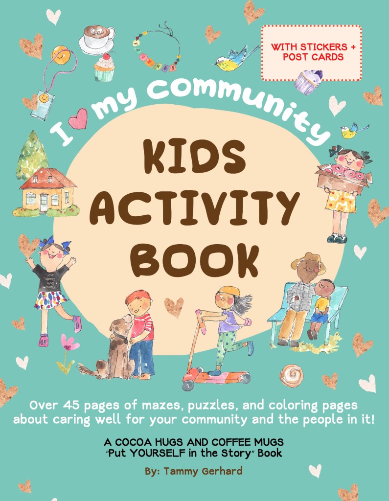 With the successful release of Cocoa Hugs and Coffee Mugs, came multiple requests for school and small group author visits across the region. Wanting to help parents and teachers encourage kids to grow in the areas of kindness and empathy, author Tammy Gerhard created her second book, a 45 page activity book, to encourage kids to love their community and the people in it. The “I Love My Community Kids Activity Book” can be used as a “stand alone” or connected to Tammy’s first picture book, “Cocoa Hugs and Coffee Mugs”.
